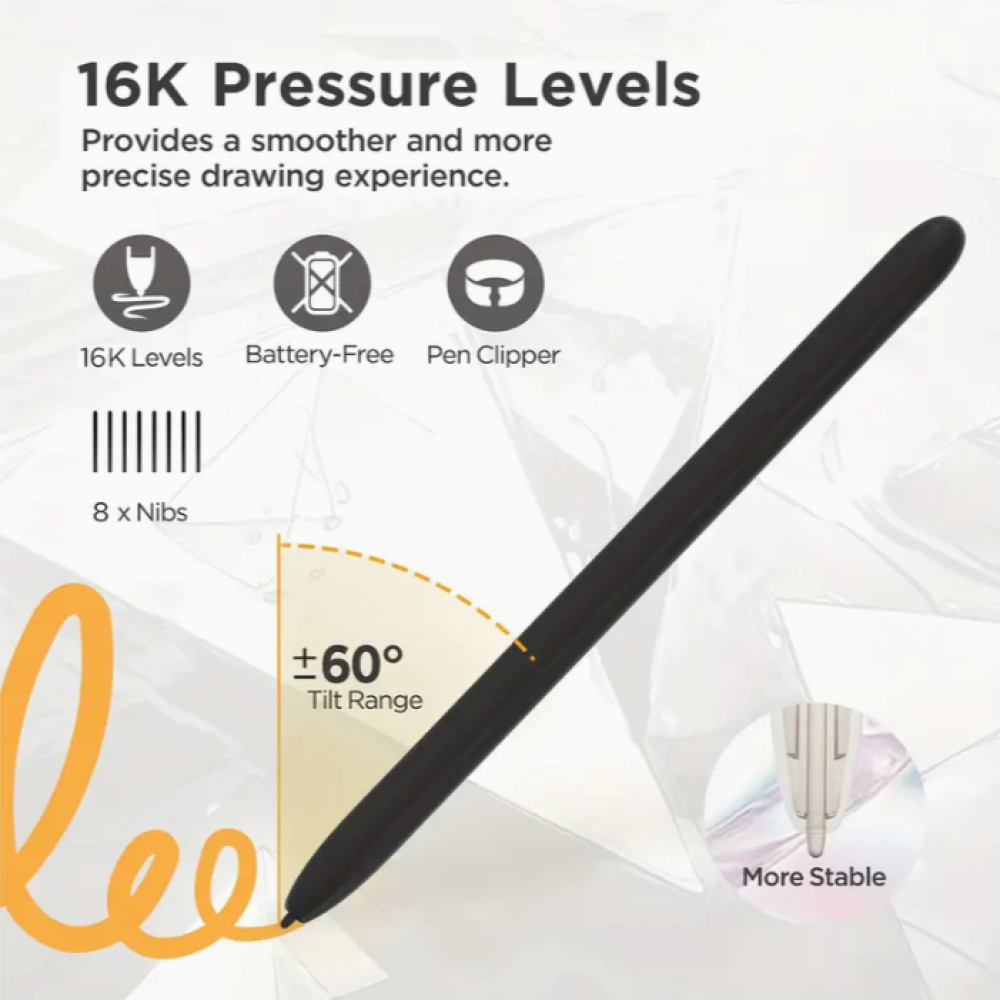 يتميز هذا القلم بتصميم مريح يضمن قبضة مريحة. بفضل مستويات حساسية الضغط التي تبلغ 16 ألفًا والتعرف على الإمالة بمقدار 60 درجة، يمكنك إنشاء خطوط دقيقة دون عناء والاستمتاع بتجربة رسم طبيعية بضربات سلسة ودقيقة (≥200 دورة في الثانية). بفضل التقنية الكهرومغناطيسية الخالية من البطاريات والشريحة السلبية المدمجة، يمكنك الانغماس في الإبداع دون انقطاع دون متاعب الشحن المتكرر.