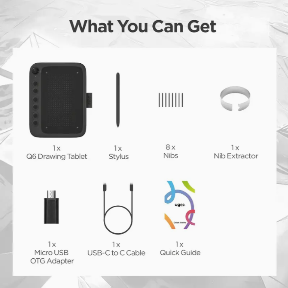 يتميز تابلت الرسم ugee Q6 بكابل مدمج من النوع C، مما يوفر الراحة وسهولة الحمل. بفضل هذا التصميم المتكامل، يصبح الجهاز اللوحي سهل التخزين وجاهزًا للاستخدام عندما يأتيك الإلهام. قل وداعًا لمتاعب البحث عن كابل منفصل - يضمن كابل Type-C المدمج أن جهازك اللوحي جاهز دائمًا لمساعيك الإبداعية.