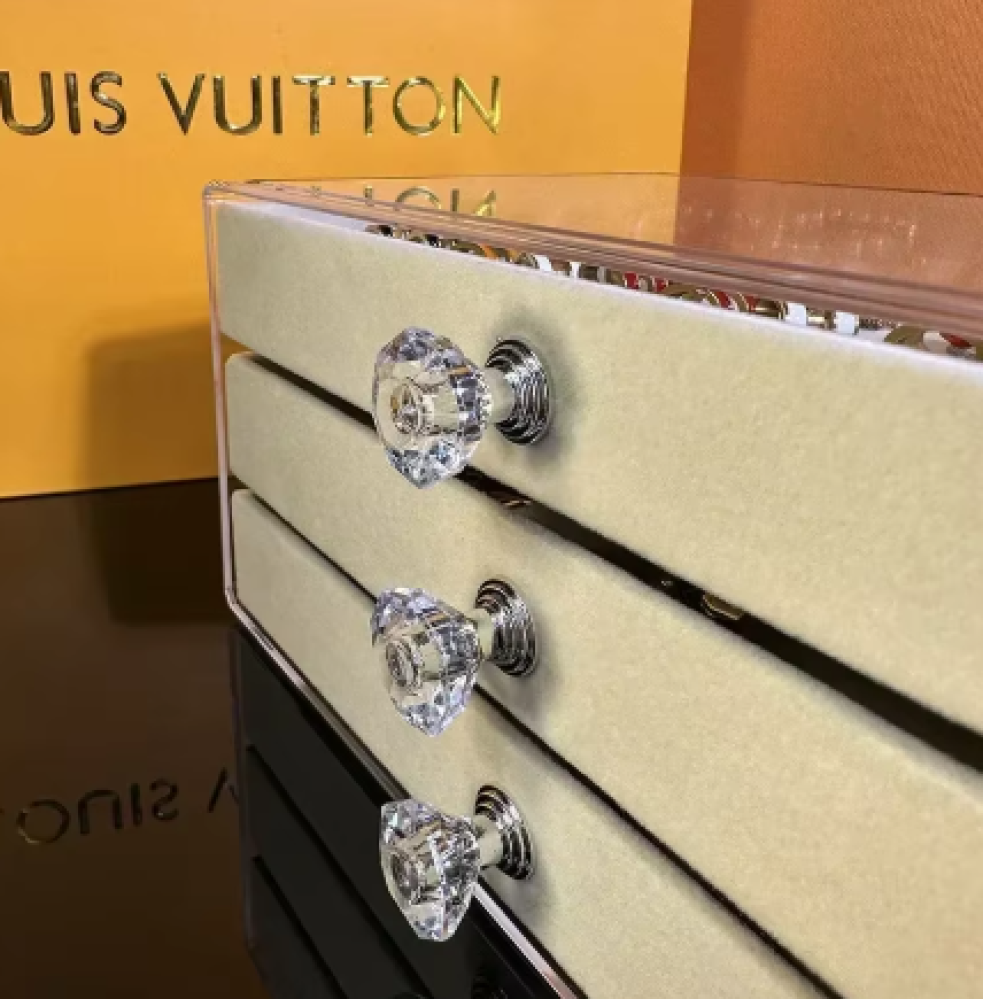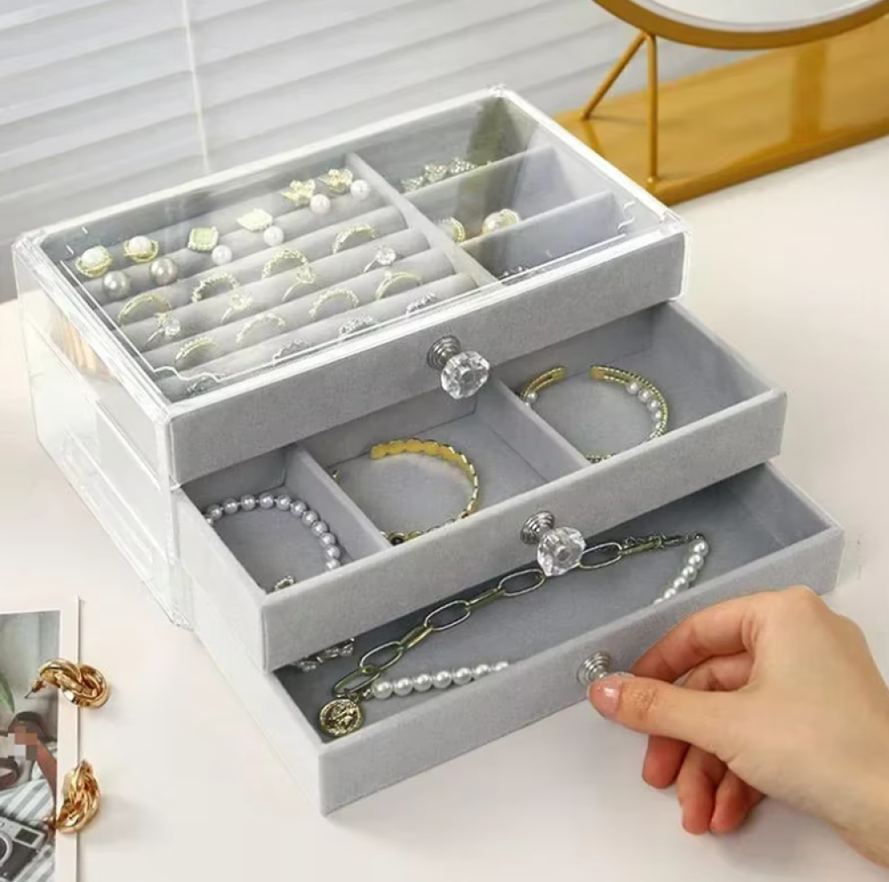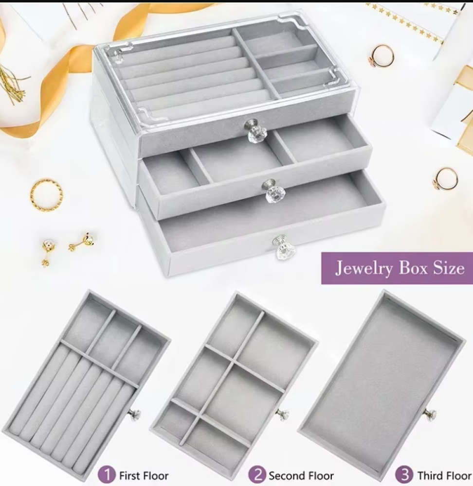 منظم مجوهرات مخملي من الأكريليك مع 3 أدراج قابل للتكديس، أقراط تخزين وقلادة وأساور وحامل صندوق للنساء